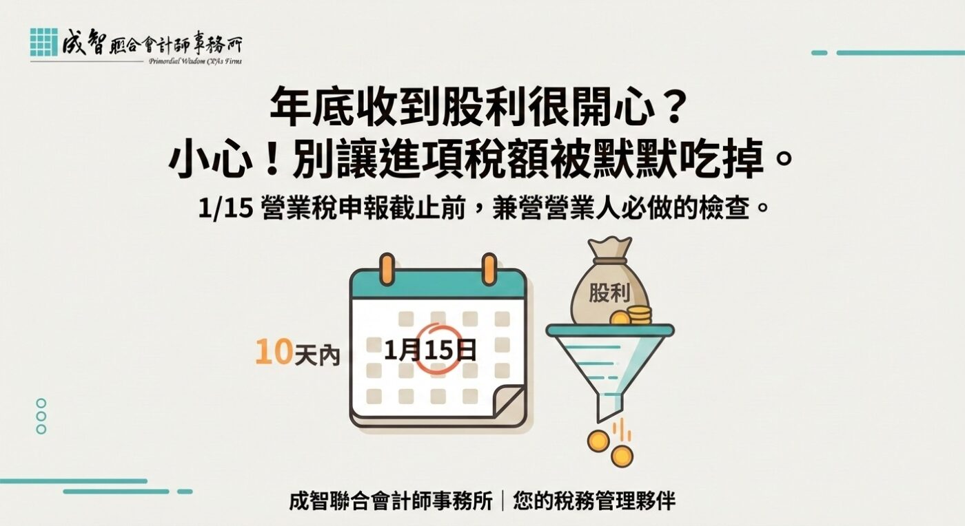 📢 本文轉載自成智聯合會計師事務所【年底收到股利很開心?小心 1/15 前少做這一步,進項稅額被「吃掉」】