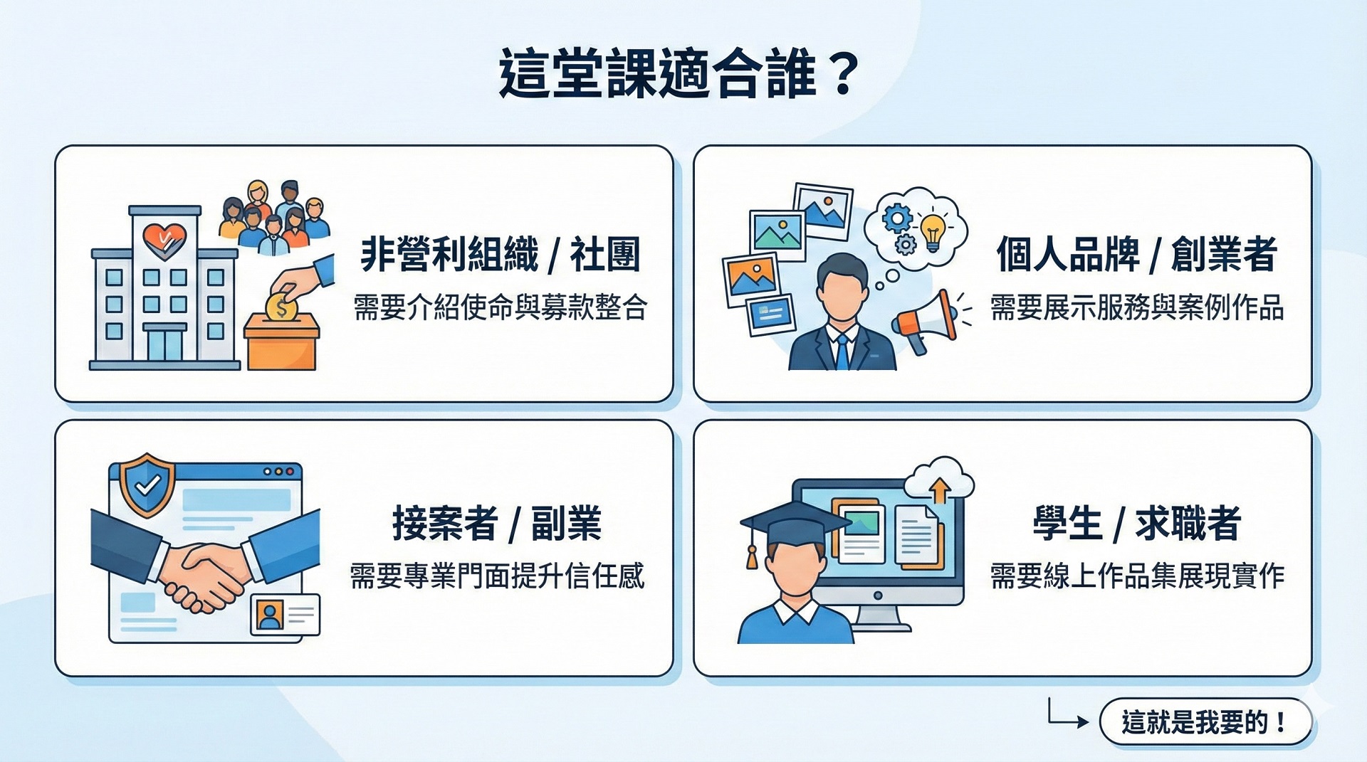• 3 小時上線: 帶走一個結構完整、具備基礎 SEO 的 WordPress 形象官網。